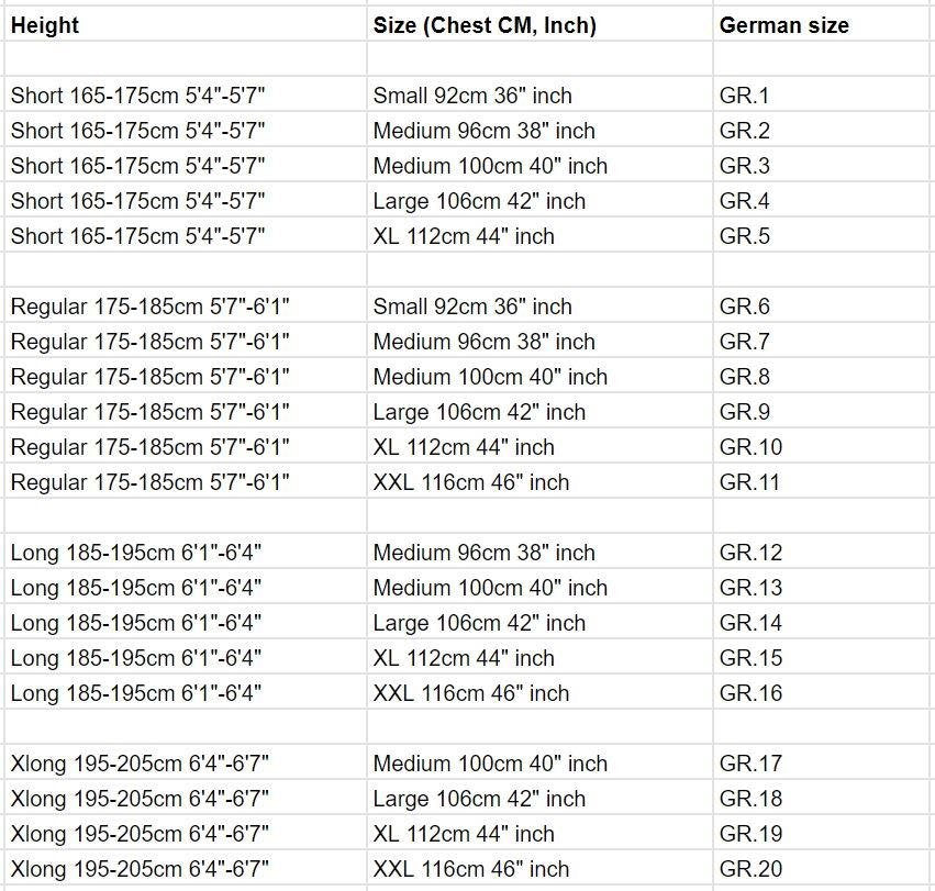 | Buca per fossa | Spalle | Manica | Lunghezza insam | Lunghezza | |