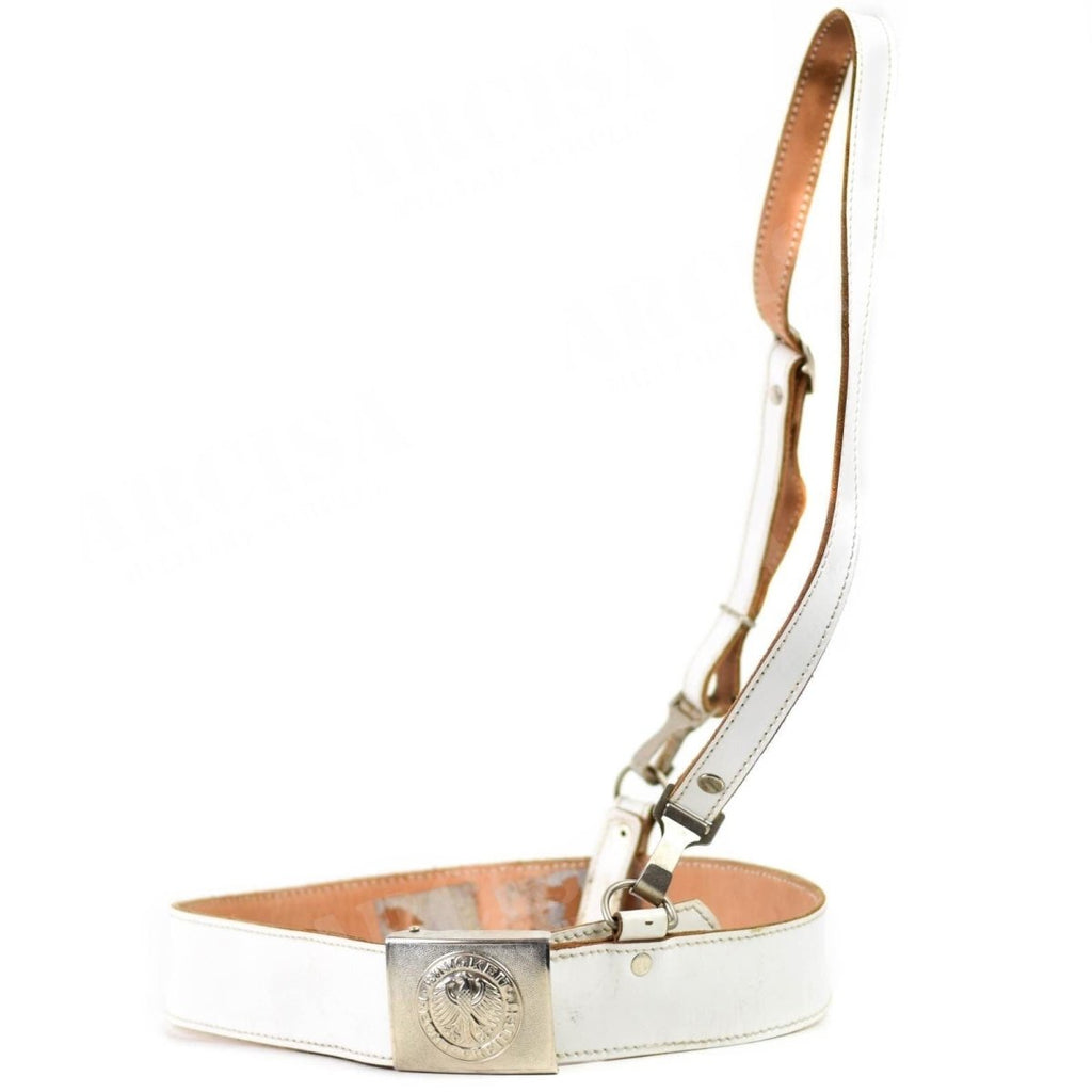 - Realizzata in pelle di alta qualità, questa cintura da parata della polizia mette in mostra l'eccellente maestria e l'attenzione ai dettagli. Il suo sorprendente colore bianco si aggiunge al suo aspetto formale e cerimoniale. La cintura è dotata anche di tracolla, che ne esalta l'estetica regale e dignitosa.