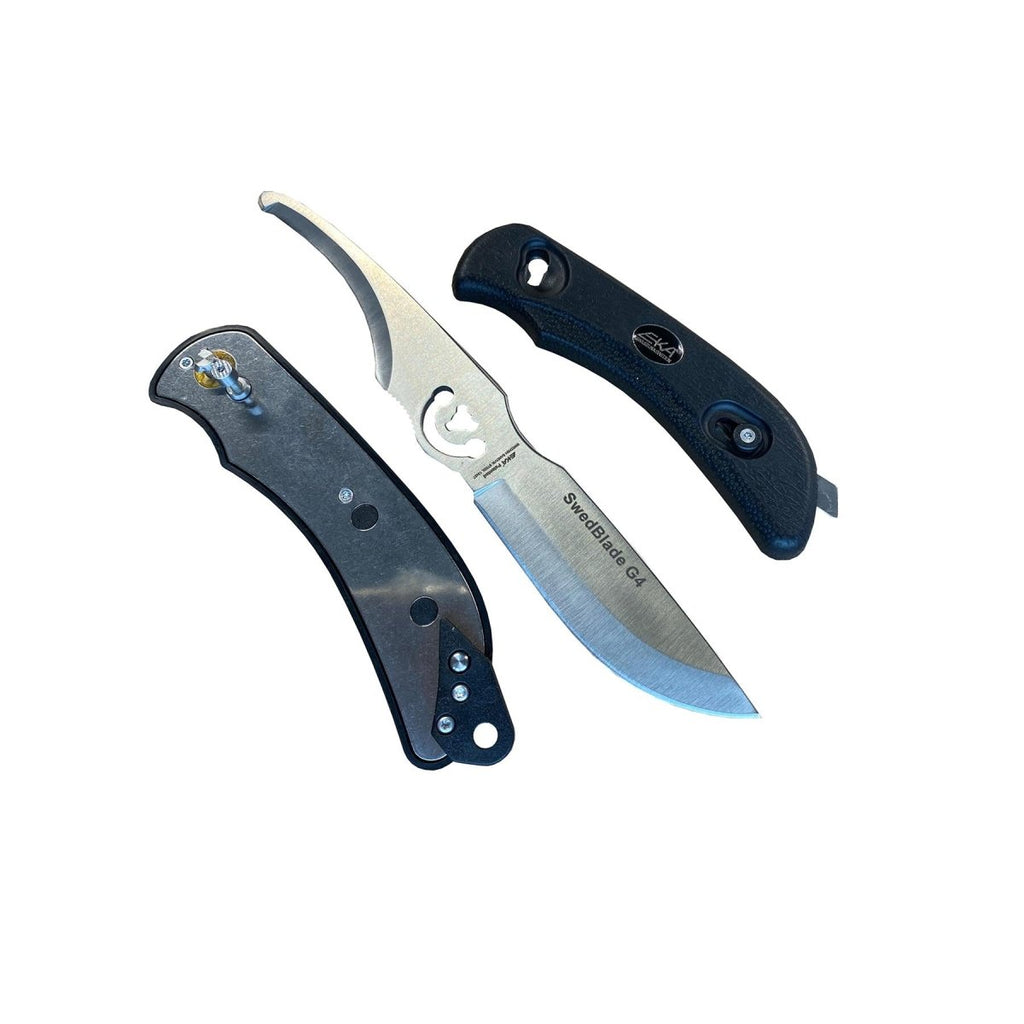 L'EKA® SwedBlade G4 utilizza un collaudato design del coltello girevole a due lame che consente l'uso e la funzionalità di due lame di stile diverso incorporate in un unico coltello. Ci sono molte fantastiche caratteristiche che aiutano a rendere EKA® SwedBlade G4 un coltello eccezionale. Ha una maniglia ergonomica ben progettata. Le lame sono realizzate con un design monopezzo in acciaio di alta qualità approvato da EKA che aiuta a garantire durata e bordi durevoli che mantengono la loro affilatura. Passa rapidamente dalla lama per scuoiare alla lama per sventrare con un semplice movimento fluido quando viene premuto il pulsante di blocco. Semplicemente e senza attrezzi clicca per smontare/montare il coltello a due lame per la pulizia dopo ogni utilizzo. Dispone anche di un punto di attacco per un cordino per tenere il tuo EKA® G4 con te e dove dovrebbe essere.