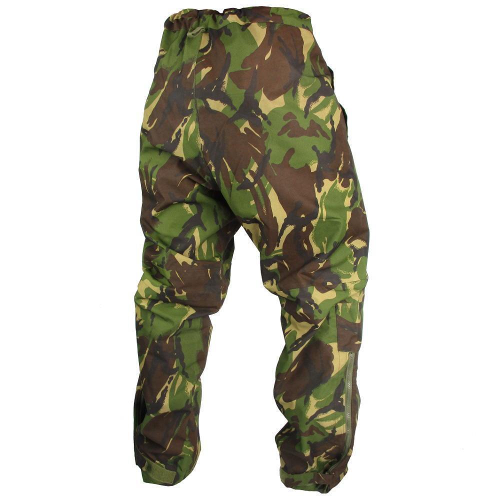 Presentazione degli originali pantaloni antipioggia mimetici DPM dell'esercito britannico: pantaloni militari in goretex, costruiti per il combattimento e l'uso all'aperto.
