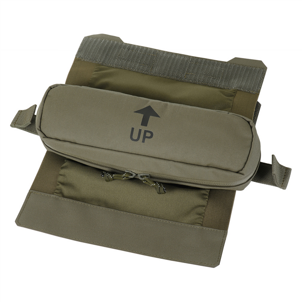 La custodia è realizzata in Cordura 500D e Cordura Squadron, materiali durevoli resistenti all'abrasione e all'uso intenso. È progettato per essere installato nella tasca posteriore di un portatarga e può anche essere integrato con altri attrezzi utilizzando il sistema di montaggio MOLLE e il pannello in velcro rimovibile.