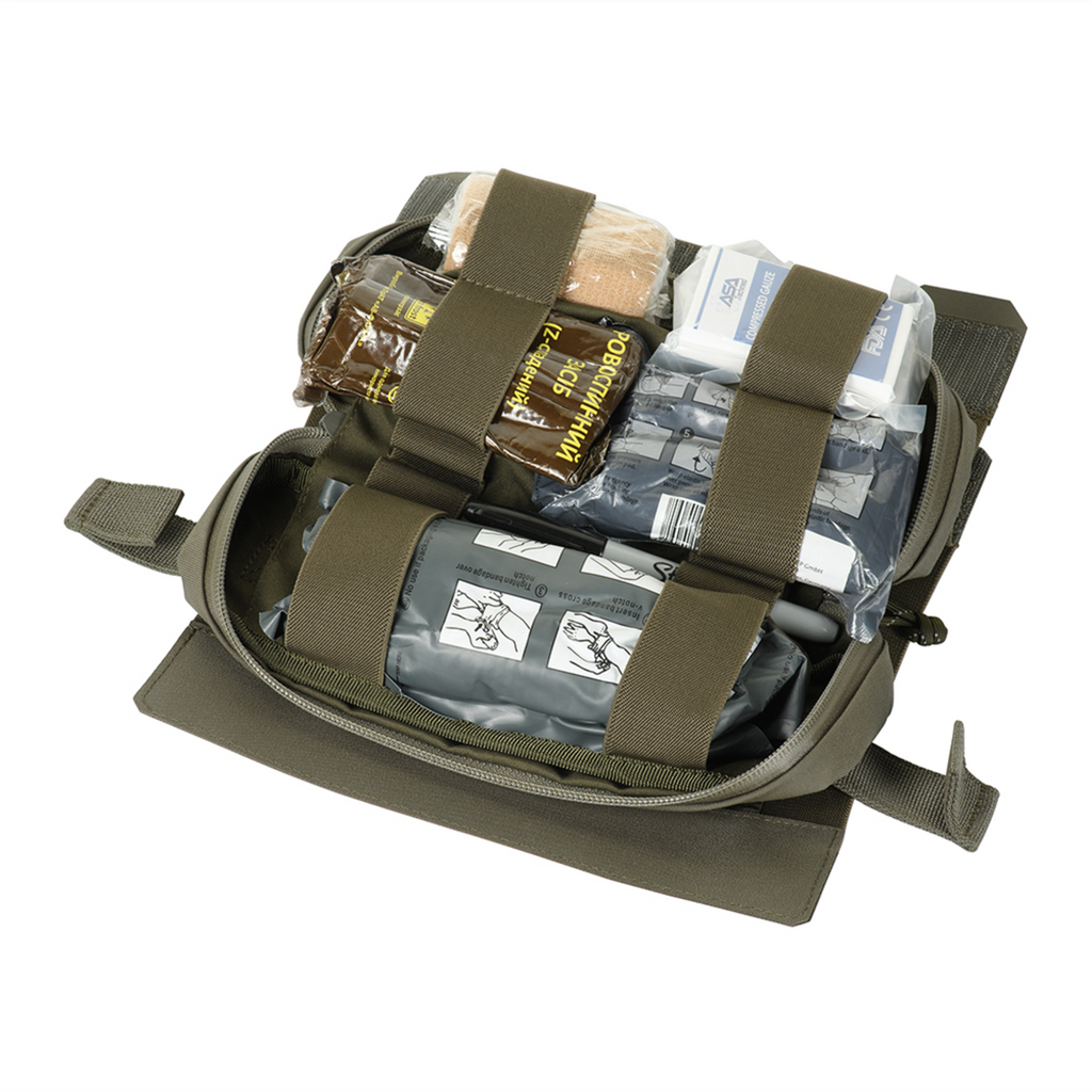 La custodia è composta da una copertura esterna e un inserto IFAK rimovibile. L'inserto può essere rimosso rapidamente tirando la cinghia, consentendo un rapido accesso alle forniture mediche. All'interno è presente un sistema organizer elastico per fissare l'attrezzatura di primo soccorso (forniture mediche non incluse).