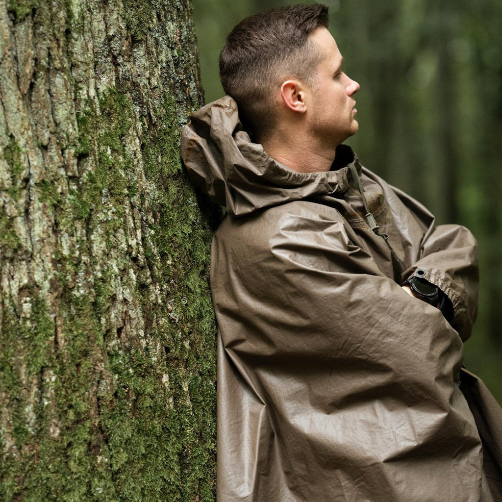 Un poncho con cappuccio militare tedesco vintage fatto con materiale impermeabile, progettato per proteggere chi lo indossa da pioggia e altri elementi. Il cofano fornisce ulteriore protezione per la testa, rendendolo una scelta pratica per le attività all'aperto e le operazioni sul campo.
