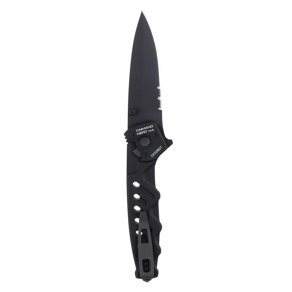 - IL lama parzialmente seghettata aggiunge versatilità extra, permettendoti di farlo tagliare materiali più resistenti con facilità. Suo finitura completamente nera dà il coltello a aspetto elegante e tattico, ideale per militari, forze dell'ordine e appassionati di outdoor.