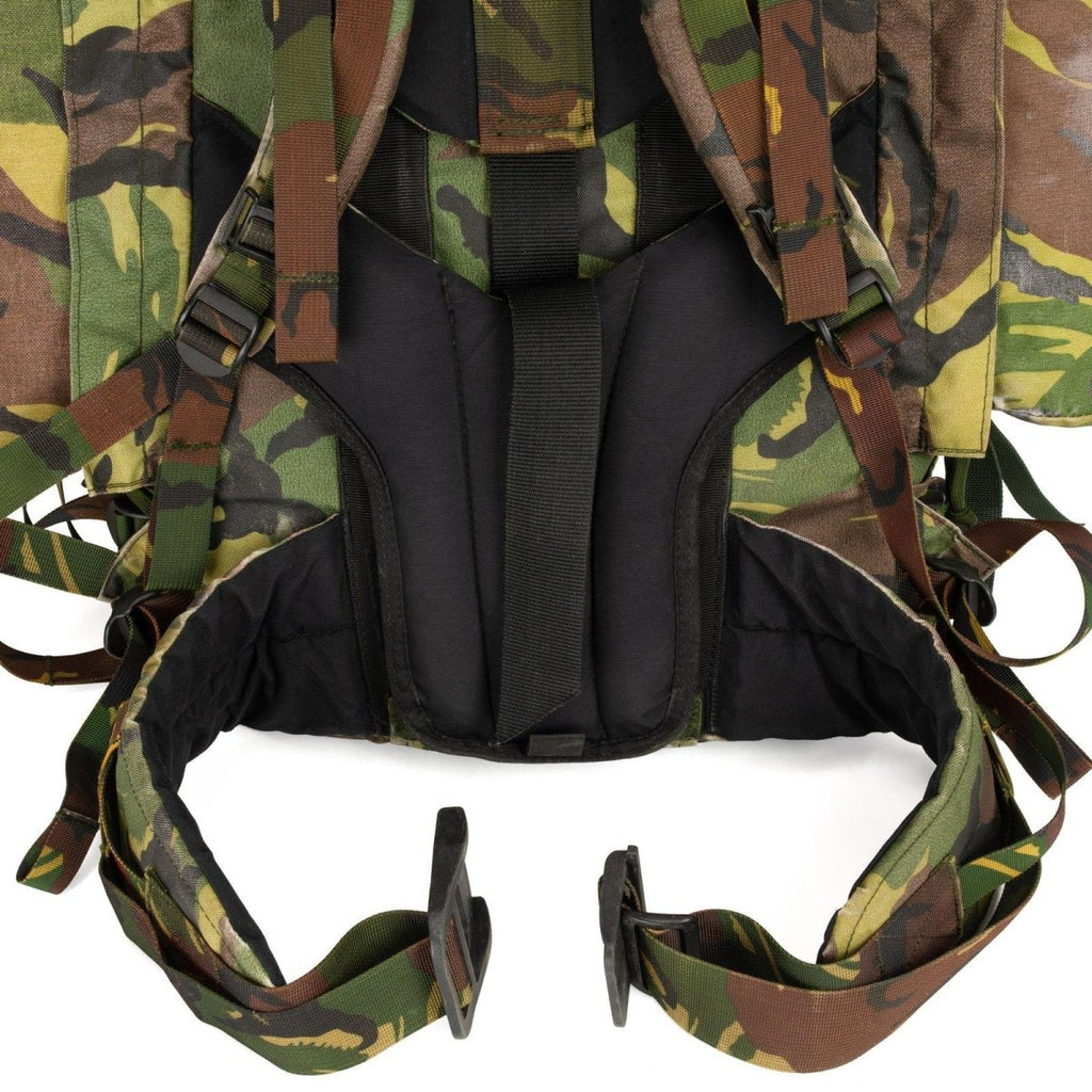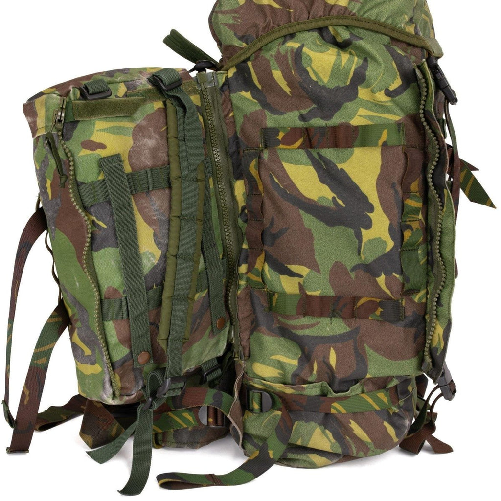 Zaino da combattimento originale dell'esercito olandese DPM con motivo mimetico prodotto da ARWY. Questo robusto zaino è dotato di uno scomparto principale con una generosa capacità di 60 litri e tasche laterali staccabili su entrambi i lati, ciascuna delle quali aggiunge ulteriori 10 litri di capacità (per un totale di 20 litri). Le tasche laterali staccate possono essere unite con cerniera e indossate comodamente come un piccolo zaino da giorno. Un telaio in alluminio è integrato nel pannello posteriore per fornire un supporto robusto e una distribuzione ottimale del peso per carichi pesanti, rendendo questo zaino ideale per missioni estese, uso tattico e avventure all'aria aperta.