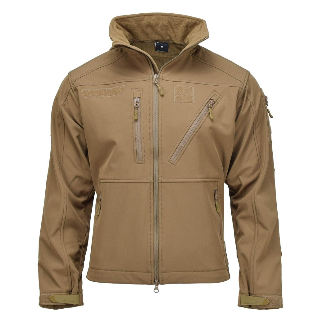 Presentazione della giacca in stile militare MIL-TEC, un'elegante giacca tattica softshell in colore coyote scuro. Questo capo versatile è dotato di cappuccio per una maggiore protezione e ascelle ventilate per una migliore traspirabilità.