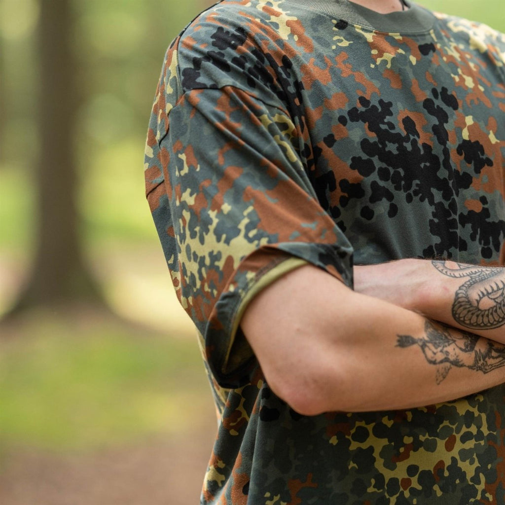 - Il motivo flecktarn si fonde bene con l'ambiente naturale, rendendolo adatto per le escursioni all'aperto. Che tu stia facendo un'escursione, un campeggio o semplicemente godendoti una giornata nella natura, questa maglietta ti manterrà comodo ed elegante. L'estetica militare aggiunge un tocco robusto che valorizza la tua attrezzatura outdoor.