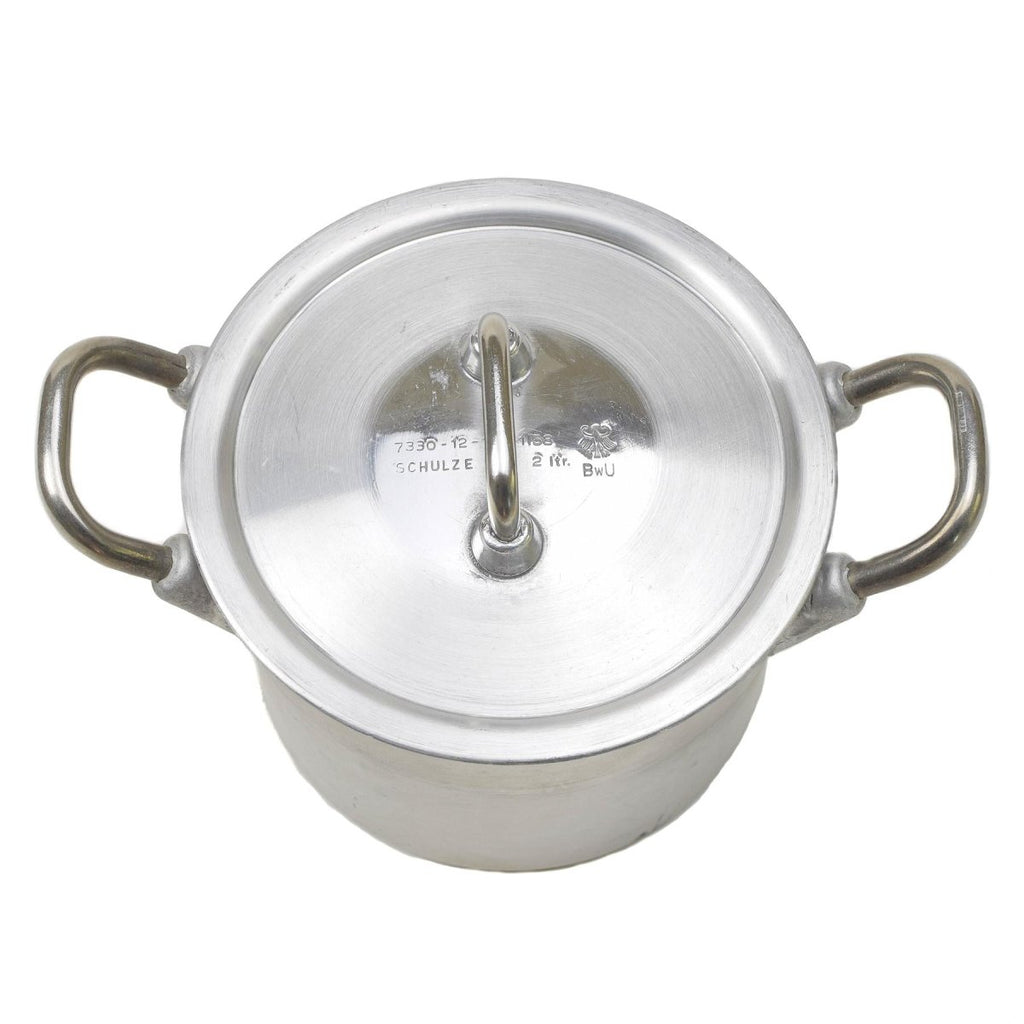 Presentiamo il versatile vaso da campeggio da 2 litri, un punto fermo nell'equipaggiamento militare tedesco, tipicamente realizzato in alluminio resistente. Questo utensile da cucina pratico e compatto è essenziale per le attività all'aperto come l'escursionismo e il campeggio.