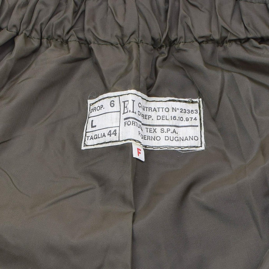 Questi sono pantaloni antipioggia militari italiani originariamente forniti ai membri dell'aeronautica militare italiana. Sono disponibili in colore oliva OD e sono foderati termicamente per maggiore calore e comfort. I pantaloni sono dotati di aperture laterali sulle gambe con gancio e anello, che li rendono facili da indossare e togliere sopra stivali o altre calzature. I pantaloni sono progettati per proteggere chi li indossa dalla pioggia e da altri elementi, e la loro struttura di livello militare garantisce che siano resistenti e durevoli. I pantaloni antipioggia militari italiani possono essere indossati da soli o sopra altri strati di abbigliamento per fornire ulteriore isolamento e protezione dagli elementi.