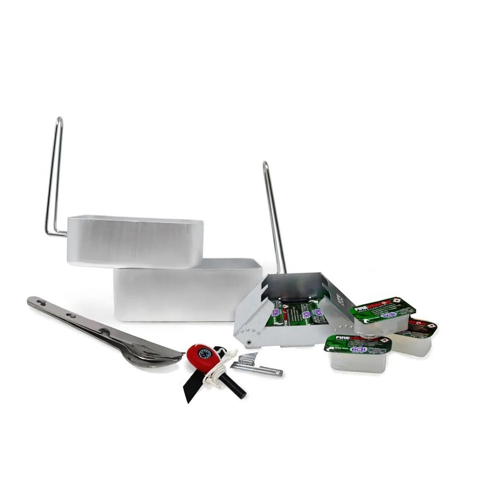 - SET INCLUDES : Stufa, scatole di pasticci, set di posate, combustibile solido, apriscatole, selce, attaccante