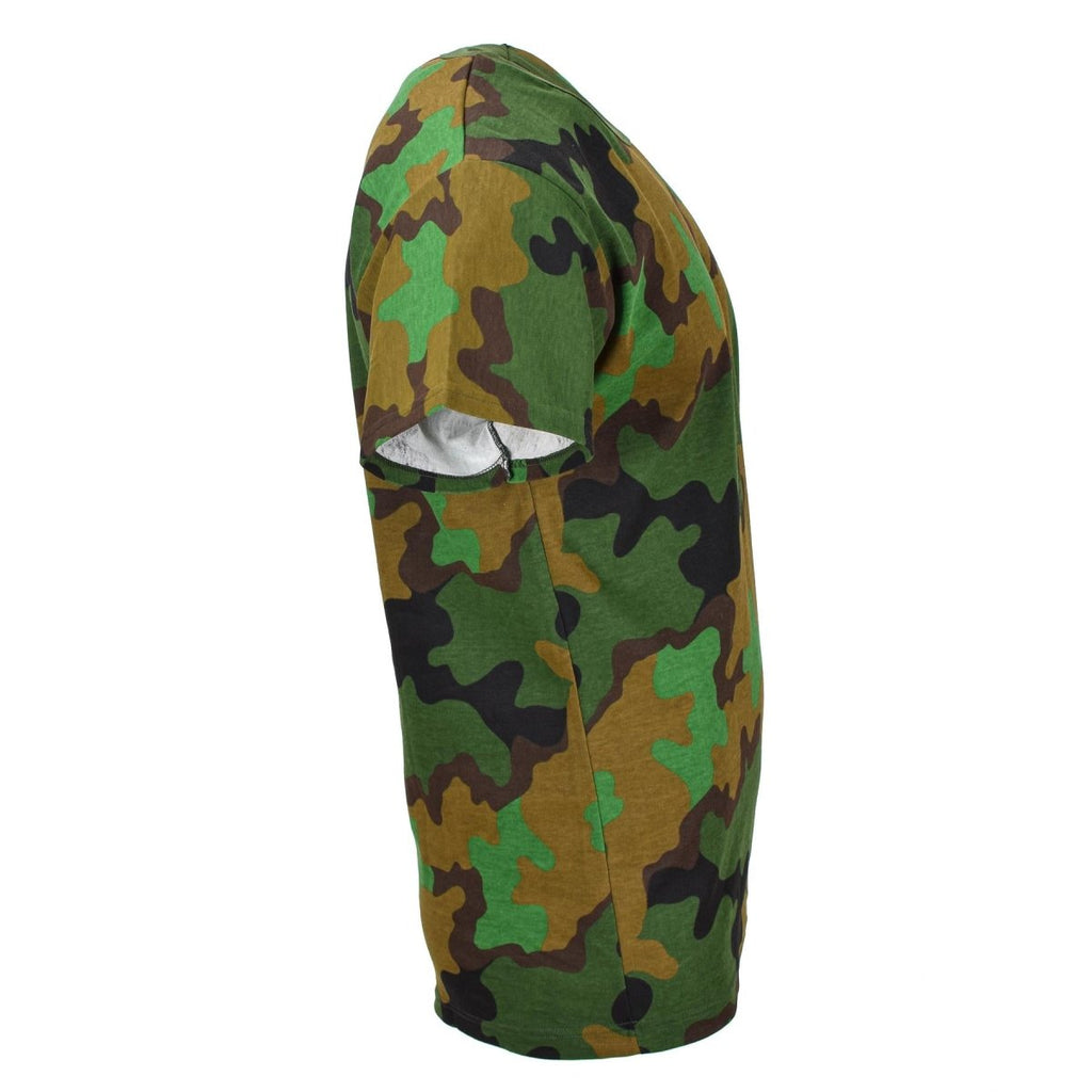 - Questa maglietta presenta un classico motivo mimetico boschivo, che la rende perfetta per mimetizzarsi in ambienti naturali. Il design si rivolge specificamente alle esigenze dei soldati nella giungla o nelle aree boschive, offrendo occultamento e praticità sul campo.