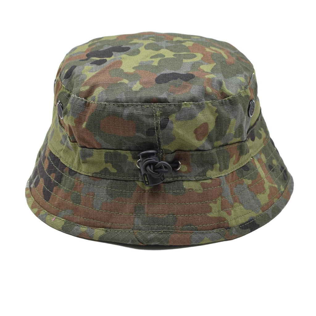 Il cappello da secchio tacgear nel camuffamento Flecktarn è realizzato in materiale di fermo, che fornisce durata e resistenza allo strappo. È dotato di fori di sfiato per una maggiore traspirabilità e comfort durante il caldo. Il cappello è progettato per proteggere la testa e il viso di chi lo indossano dal sole e altri elementi ambientali. Il modello di camuffamento Flecktarn è comunemente usato dagli appassionati di militari e di caccia, rendendolo adatto per le attività all'aperto.