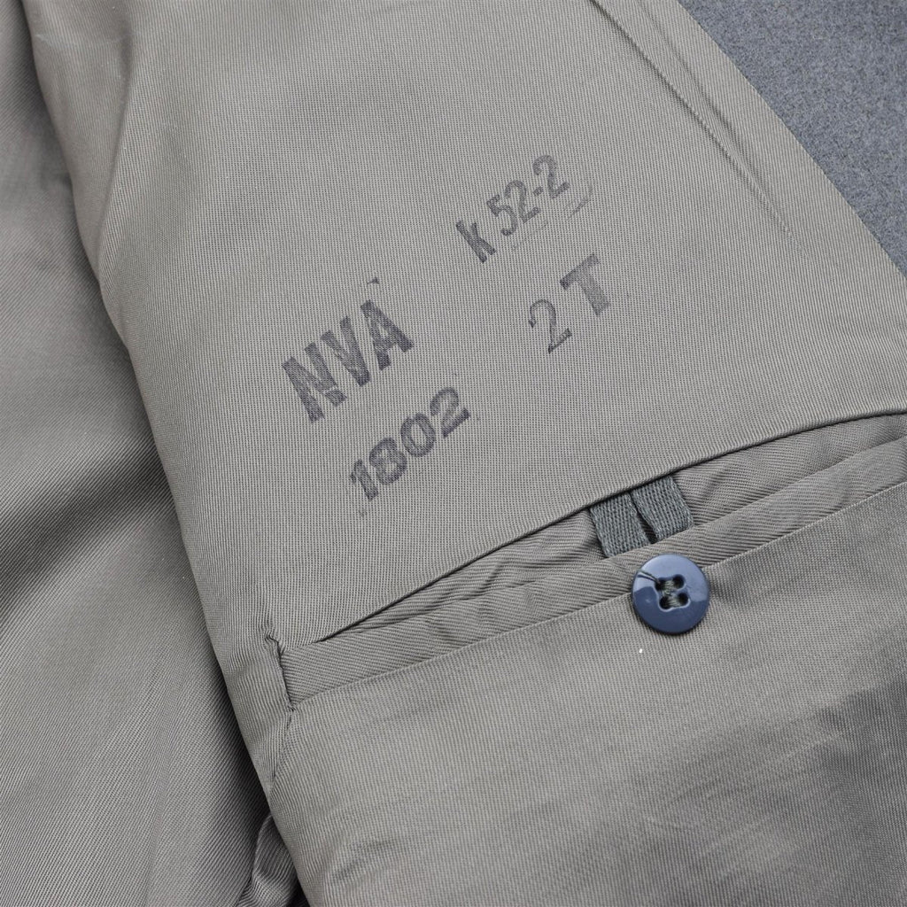 La giacca è realizzata nel tradizionale taglio militare della Germania dell'Est e presenta un design strutturato con tasche frontali e chiusura con bottoni. Viene consegnato con spalline e toppe sul colletto originali, come mostrato, che ne aumentano l'autenticità e il valore collezionistico.