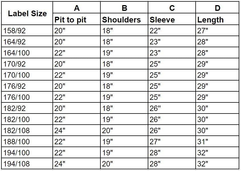 | Buca per fossa | Spalle | Manica | Lunghezza | |